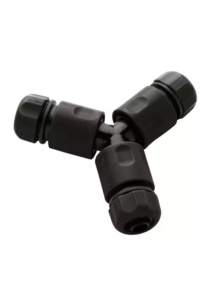 Designed for use with our Snip-n-Drip Soaker System, this three-way connector makes it easy to water two rows. Simply attach the solid hose to one side, and run two soaker hoses from the other two sides.