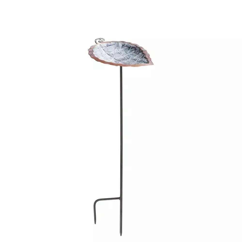 This lovely small bird bath — or feeder — is shaped like a leaf, with a texture enhanced by the verdigris finish within the bowl. Includes threaded stake.
