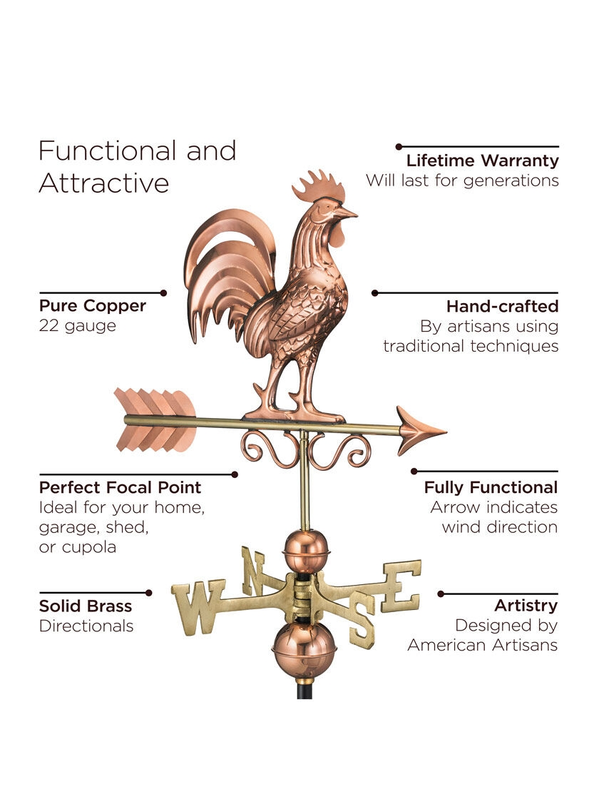 Crafted with an intricate attention to detail, these Bantam Rooster Weathervanes hearkens back to a simpler time. For over 35 years Good Directions Pure Copper Weathervanes have been unsurpassed in style, quality, and durability – perfect for the house-proud homeowner. Bring the Joy of Outdoor Living℠ to your home with this heirloom-quality piece. Does not include a roof mount. The pure copper will age naturally over time.