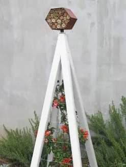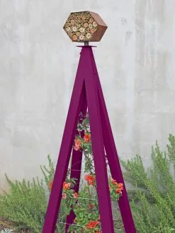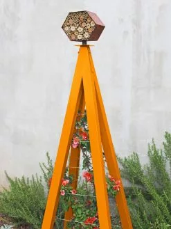 The Bee Bungalow together with the Akoris Garden Tuteur provides a modern/rustic habitat the hippest bees will buzz about! This combo is a perfect nesting opportunity for solitary native “super pollinators” you WANT in your garden! Made of natural oxidized steel, the bungalow contains hand-cut natural lake bed reeds and drilled-out branches with a variety of openings to make it easy for the bees to find their “home.” The trellis allows edible and ornamental plants to weave throughout, creating a spectacular tapestry while providing sturdy support..