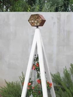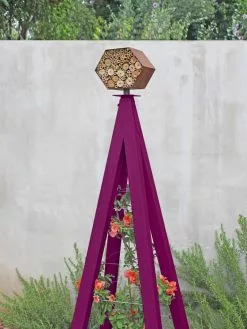 The Bee Bungalow together with the Akoris Garden Tuteur provides a modern/rustic habitat the hippest bees will buzz about! This combo is a perfect nesting opportunity for solitary native “super pollinators” you WANT in your garden! Made of natural oxidized steel, the Bungalow contains hand-cut natural lake bed reeds and drilled-out branches with a variety of openings to make it easy for the bees to find their “home.” The trellis allows edible and ornamental plants to weave throughout, creating a spectacular natural tapestry while providing sturdy support in the garden..