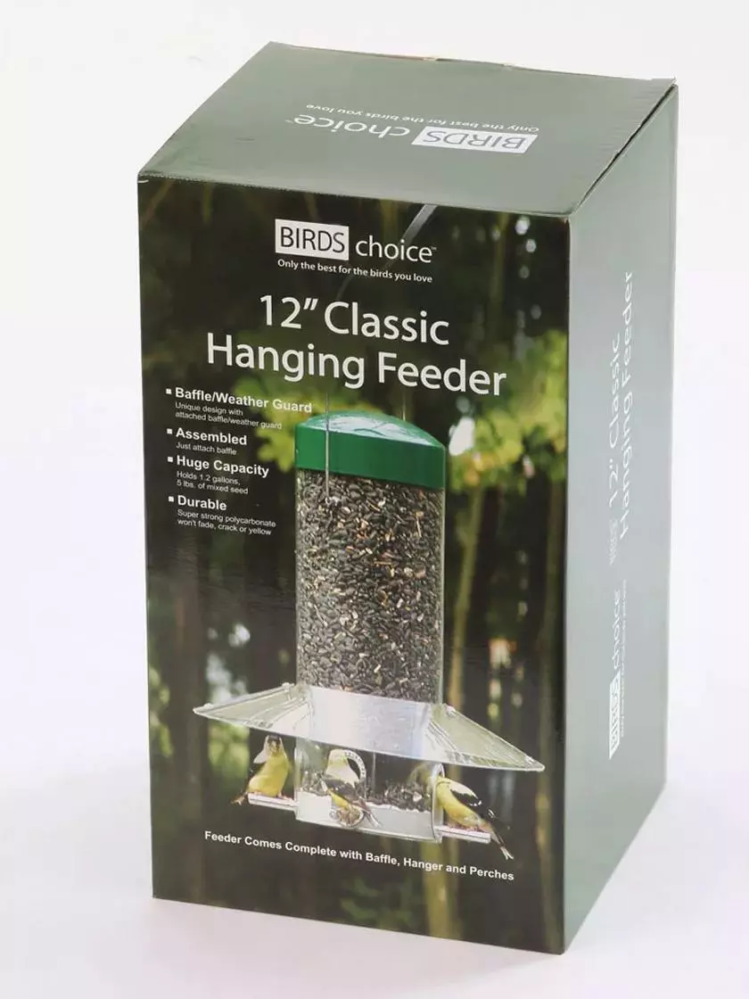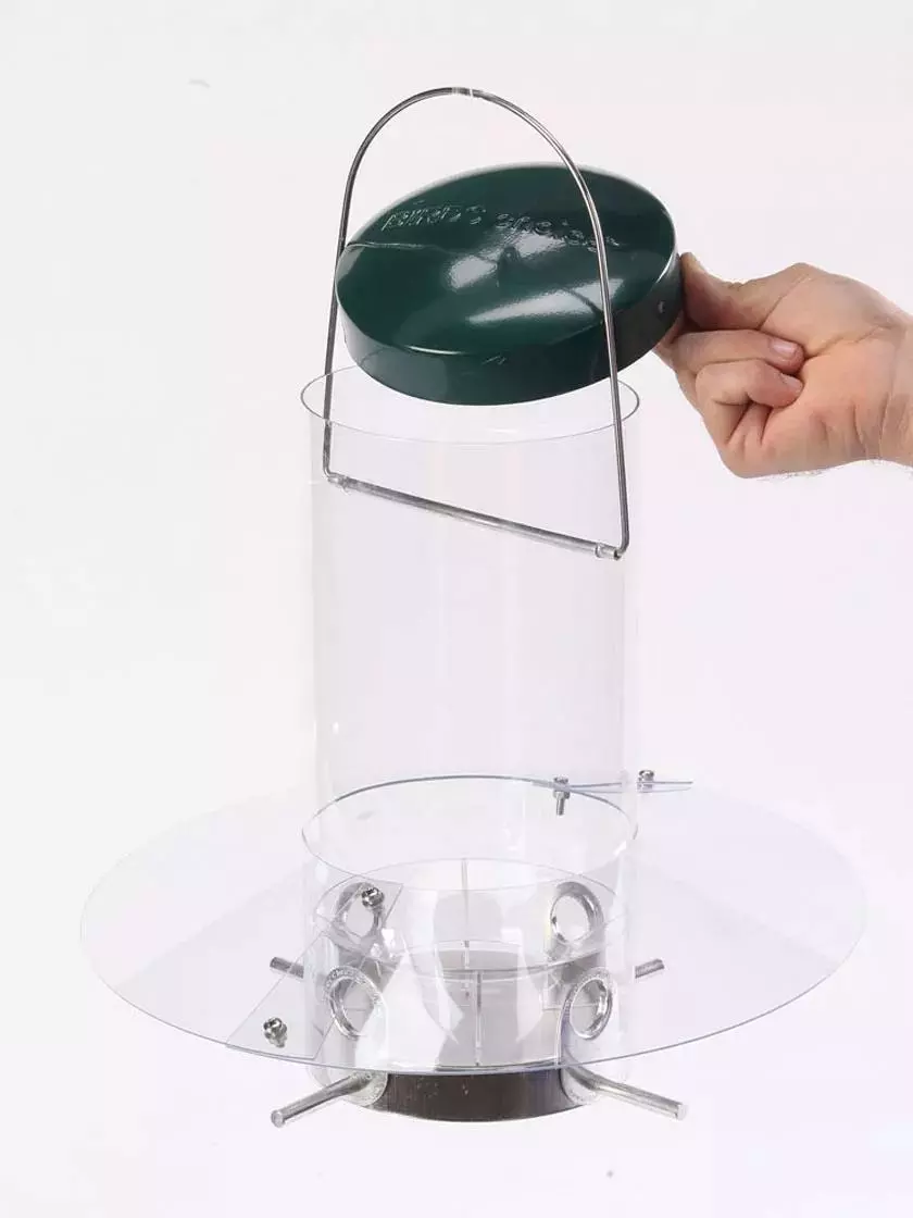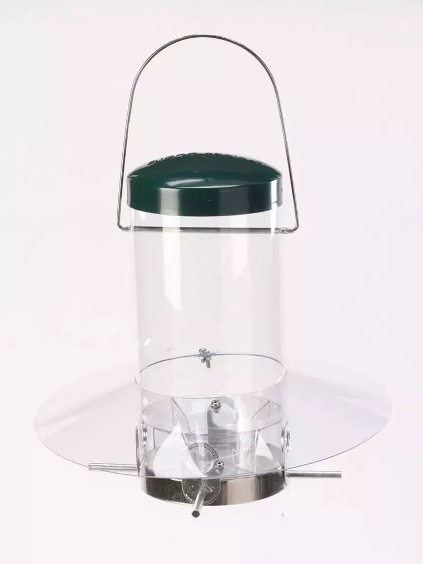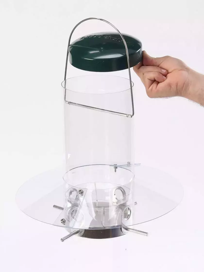 Baffle/weatherguard is made from 100% polycarbonate and protects seed from rain and snow. It can also help keep larger birds away if desired by lowering it closer to the ports. The Polycarbonate tube is 6″ in diameter and 12″ in length. Holds approximately 4 lbs. of seed (weight can vary depending on type of seed). Complete with 4 aluminum seed ports and perches. Features a green baked enamel coated top, this will ensure years of dedicated use. Includes a metering ring to distribute the seed to the ports. For best results, maintain a seed level of 3-4 inches. This has been a very popular feeder for over 20 years.