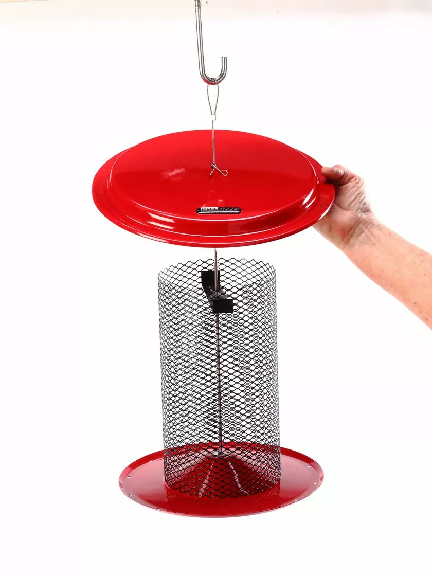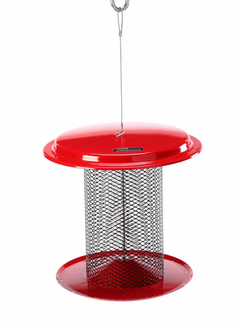 This sunflower bird feeder is built to last a lifetime. Featuring all steel construction and patented magnet-mesh, the feeder holds 5 quarts of sunflower seed to attract birds of all types. Birds cling all over the screen and perch on the powdercoated red landing platform that doubles as a seed catching tray. Easy to fill and clean, and includes hanging cable.