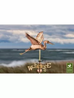 Heading away from his marsh pond nest, this Great Blue Heron is ready to adorn the rooftop of smaller structures, sheds, and gazebos. For over 35 years Good Directions pure copper weathervanes have been unsurpassed in style, quality, and durability – perfect for the house-proud homeowner. Bring the Joy of Outdoor Living℠ to your home with this heirloom-quality piece. Easy-to-assemble and install. Includes an all-weather Roof Mount and assembly rod, solid brass 11″L directionals and copper globes. This size weathervane is ideal for smaller structures, sheds and gazebos. Lifetime Warranty. The beautiful Blue Verde℠ Copper instantly displays the historic look of aged copper. The Pure Copper will age naturally over time.