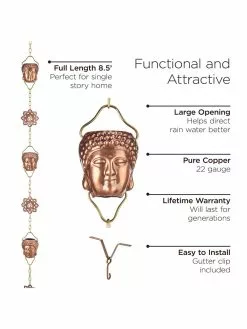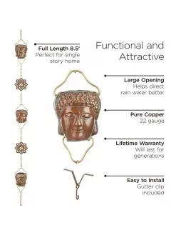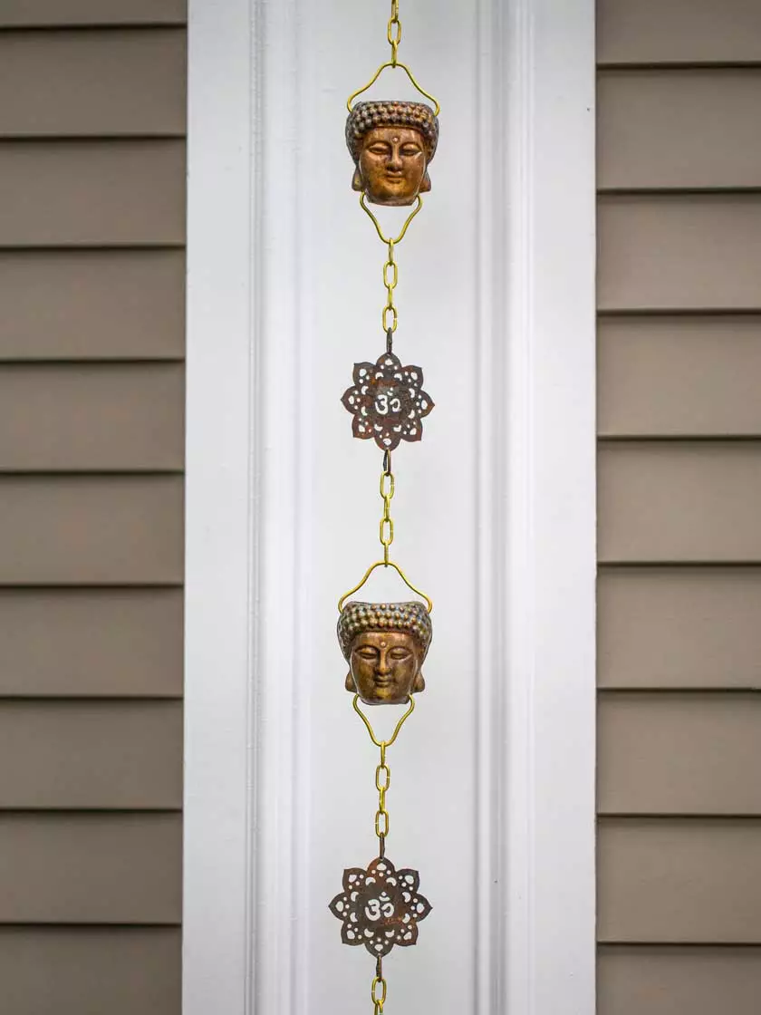 The Buddha Rain Chain from Good Directions is artistically-designed and handmade using pure copper to create a rain chain that is both beautiful and functional. The finish is designed to look like a vintage Buddha found in an archeological dig. Alternating 3.5-inch large cups Buddhas and ohm ornaments link together wonderfully with brass chain to form an 8.5-foot rain chain that promotes water flow and allows water to cascade beautifully from rooftop to ground. Each wide-mouthed Buddha cup is carefully-crafted to promote a smooth flow of water to the peaceful ohm ornaments below. For easy installation a gutter clip is included. You will hope for rain when you replace your ordinary gutter downspout with this Zen inspired rain chain.