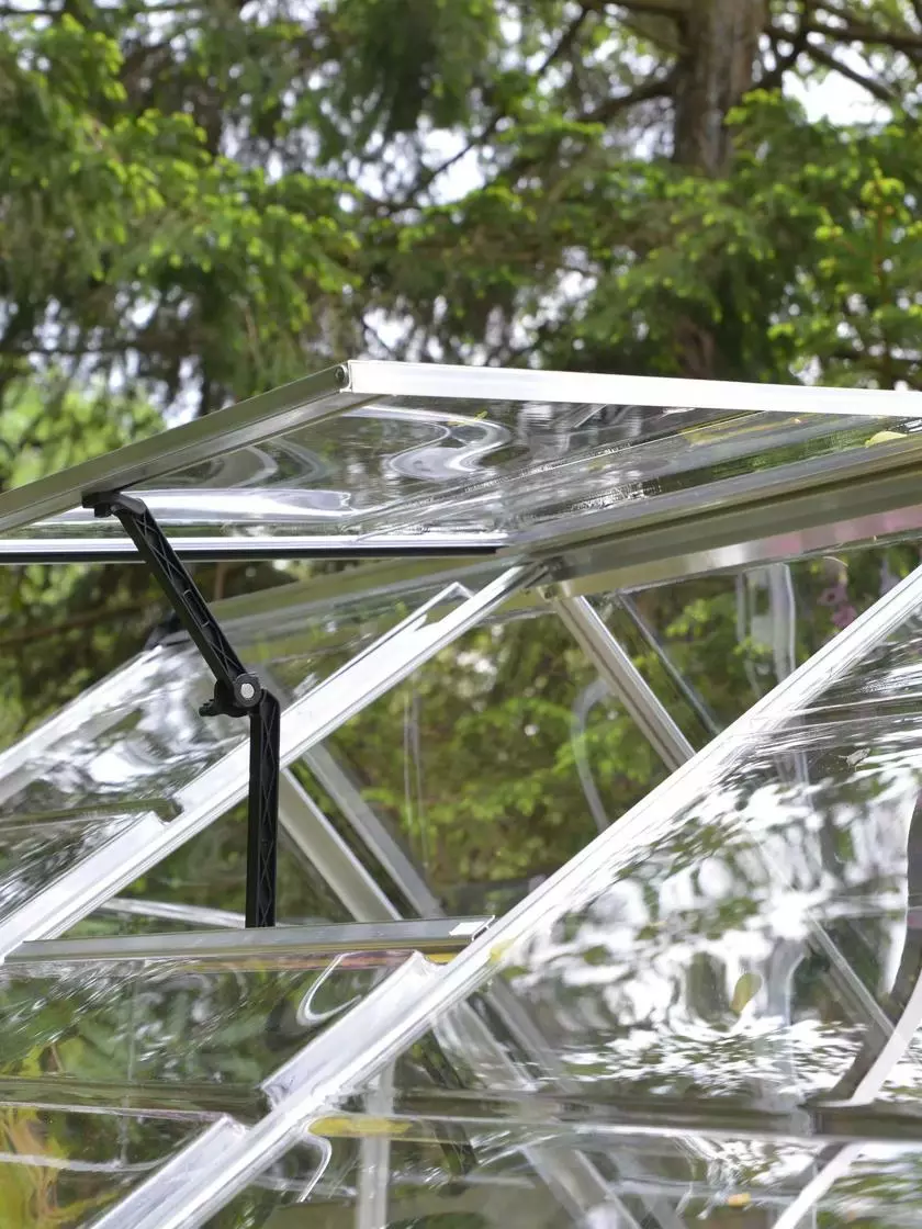 - Includes 2 large adjustable vent windows for ventilation, galvanized steel perimeter base for additional stability & alignment and a friendly magnetic door catch to keep the greenhouse open