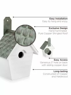Attract a variety of beautiful songbirds. Comfort comes easily with the Classic Cottage Bird House. The 1.5″ perch-less entry protects from nest-raiding paws, giving birds the freedom to enjoy their home. A generous 3” hole on back with sliding copper door makes clean-up a breeze. Air vents circulate fresh air through the space and drainage holes are in the base. The long-lasting, mango hardwood base is complete with a pattern of horizontal lines, it’s an appealing addition to any outdoor oasis.