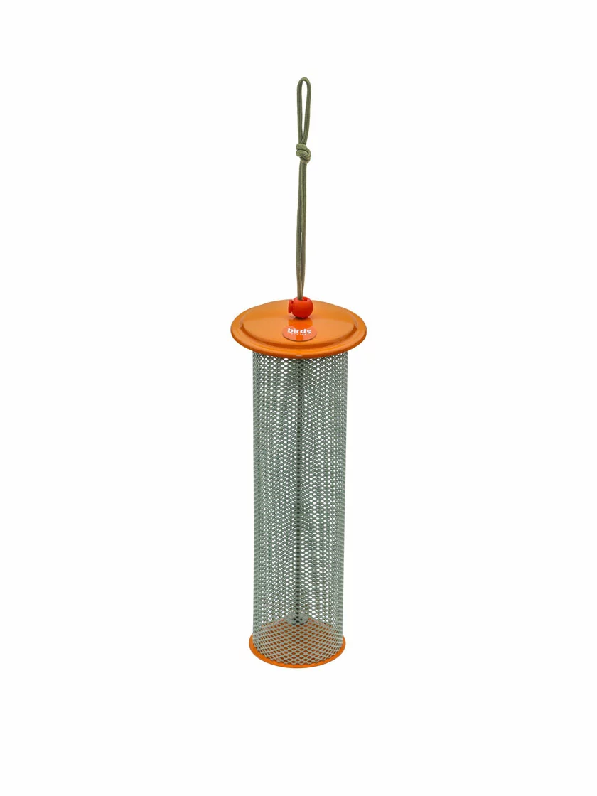 Made in the usa, all metal construction, powder coated top, bottom and screen, center seed diverter, paracord hanger with cordlock, capacity: approximately 1.5 Lbs. Of nyjer, special finch mix, hulled sunflower seed. Attracts siskins, purple finches, titmice, goldfinches, house finches, indigo buntings, juncos.