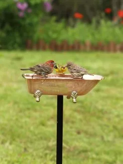This durable bird bath is made from pure copper which is a natural germ-killer and helps maintain a sanitary bird bath. The copper will age naturally over time. A staked garden pole serves as a sturdy support for this bird bath. Creativity combined with high-quality materials, producing a piece that is built-to-last. The decorative edge doubles as a retreat for feathered-friends to rest between drinks. This makes a great gift for every bird lover. Perfect for birds and house-proud homeowners alike. Bring The Joy of Outdoor Living℠ to your home with this heirloom-quality piece.