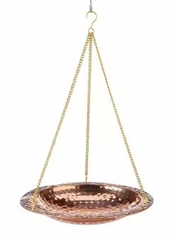 The Hanging Copper Bird Bath combines functionality and class to create a calm and comfortable oasis for birds. The piece doubles as a focal point that adds to the ambiance of any outdoor area. Birders will gaze in awe as their feathered-friends splash and play throughout the day. A decorative-lip encircling the bowl provides space for birds to perch. Durable by design, this bird bath is built to last with a pure copper bowl and chains of brass. Easily hang from a hook and watch with delight.