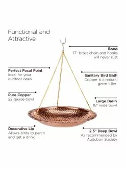 The piece doubles as a focal point that adds to the ambiance of any outdoor area. Birders will gaze in awe as their feathered-friends splash and play throughout the day. A decorative-lip encircling the bowl provides space for birds to perch. Durable by design, this bird bath is built to last with a pure copper bowl and chains of brass. Easily hang from a hook and watch with delight.