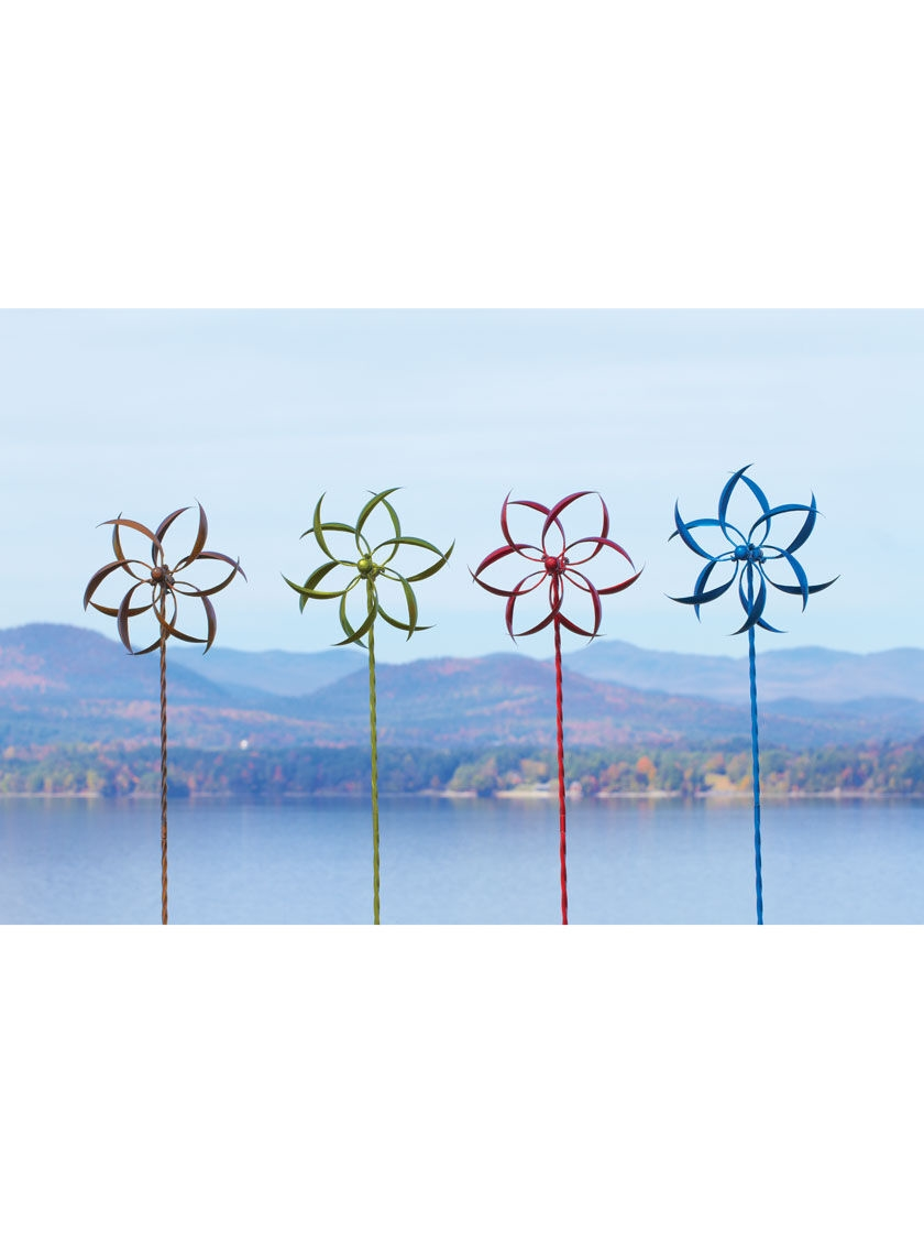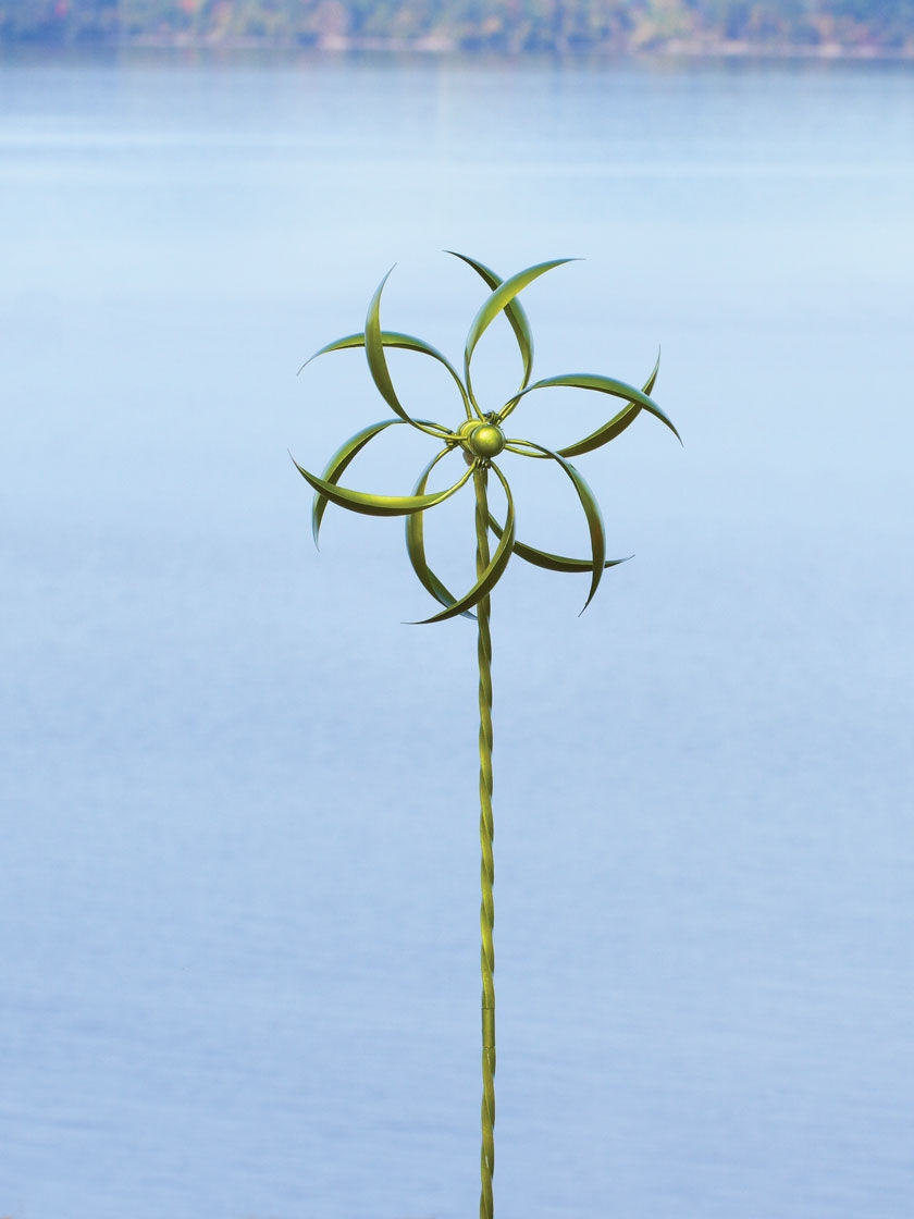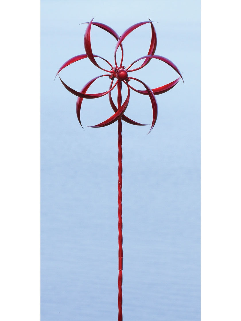 This bright metallic-colored wind spinner will be an added attraction in your garden or landscape. We recommend facing toward prevailing wind. Loose soil installation: we recommend embedding stake in concrete. To prevent weathering, additional clear poly coats can be applied.