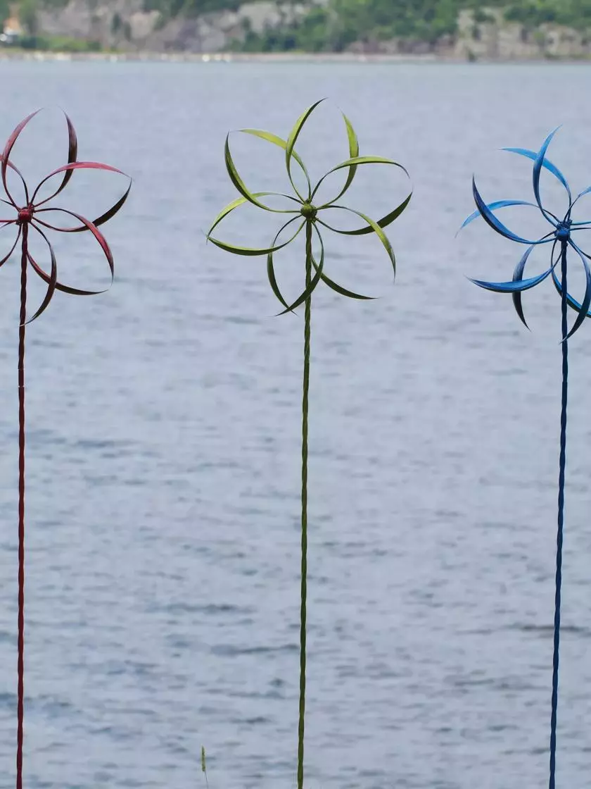 This bright metallic-colored wind spinner will be an added attraction in your garden or landscape. We recommend facing toward prevailing wind. Loose soil installation: we recommend embedding stake in concrete. To prevent weathering, additional clear poly coats can be applied.