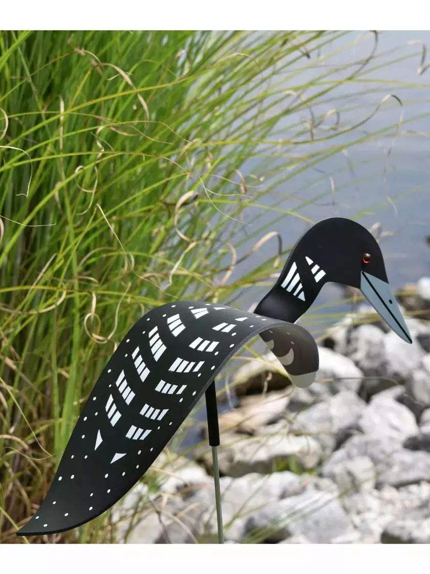 This Loon dances on the slightest breeze. Our special hinge allows it to swivel and dip atop a 35″ galvanized stake. It is 17″ long x 7″ wide. Made from UV-resistant PVC, entirely hand painted and hand formed, it is durable in day-to-day weather. Simply lift off the stake to take in during severe weather or extreme temperatures. Made in the USA.