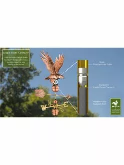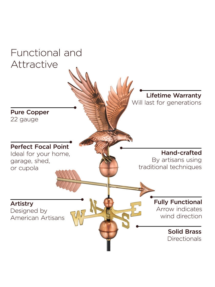 Eagles are admired the world over as living symbols of power and freedom. Now our Freedom Eagle can adorn the rooftop of your home, garage, cupola or barn. For over 35 years Good DirectionsPure Copper Weathervanes have been unsurpassed in style, quality, and durability – perfect for the house-proud homeowner. Bring The Joy of Outdoor Living℠ to your home with this heirloom-quality piece. The pure copper will age naturally over time.
