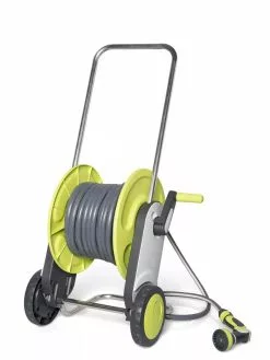 A superior hose reel, it won’t flip or tip over on you. Stabilizing spikes anchor it firmly to the ground so you can pull on the hose with confidence. 8-jet nozzle snaps on and off with a single, leak-free click. Part of an innovative Italian line of watering products that integrate high design, engineering, and craftsmanship.