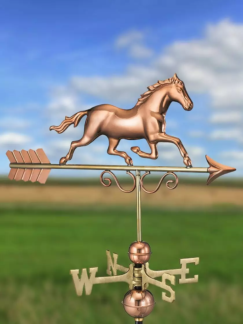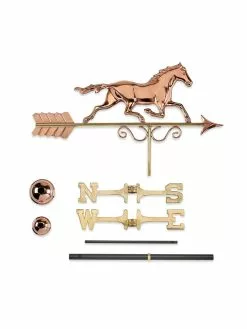 This Galloping Horse Weathervane gracefully swings with the wind atop your roof, serving as a reminder of a great colonial homestead. For over 35 years Good Directions Pure Copper Weathervanes have been unsurpassed in style, quality, and durability – perfect for the house-proud homeowner. Bring the Joy of Outdoor Living℠ to your home with this heirloom-quality piece. Easy-to-assemble and install. Includes an assembly rod, solid brass 15″ L directionals and copper globes. Does not include a roof mount. Lifetime Warranty. The pure copper will age naturally over time. This size weathervane is ideal for your home, garage, cupola, barn or gazebo. Designed by American Artisans.