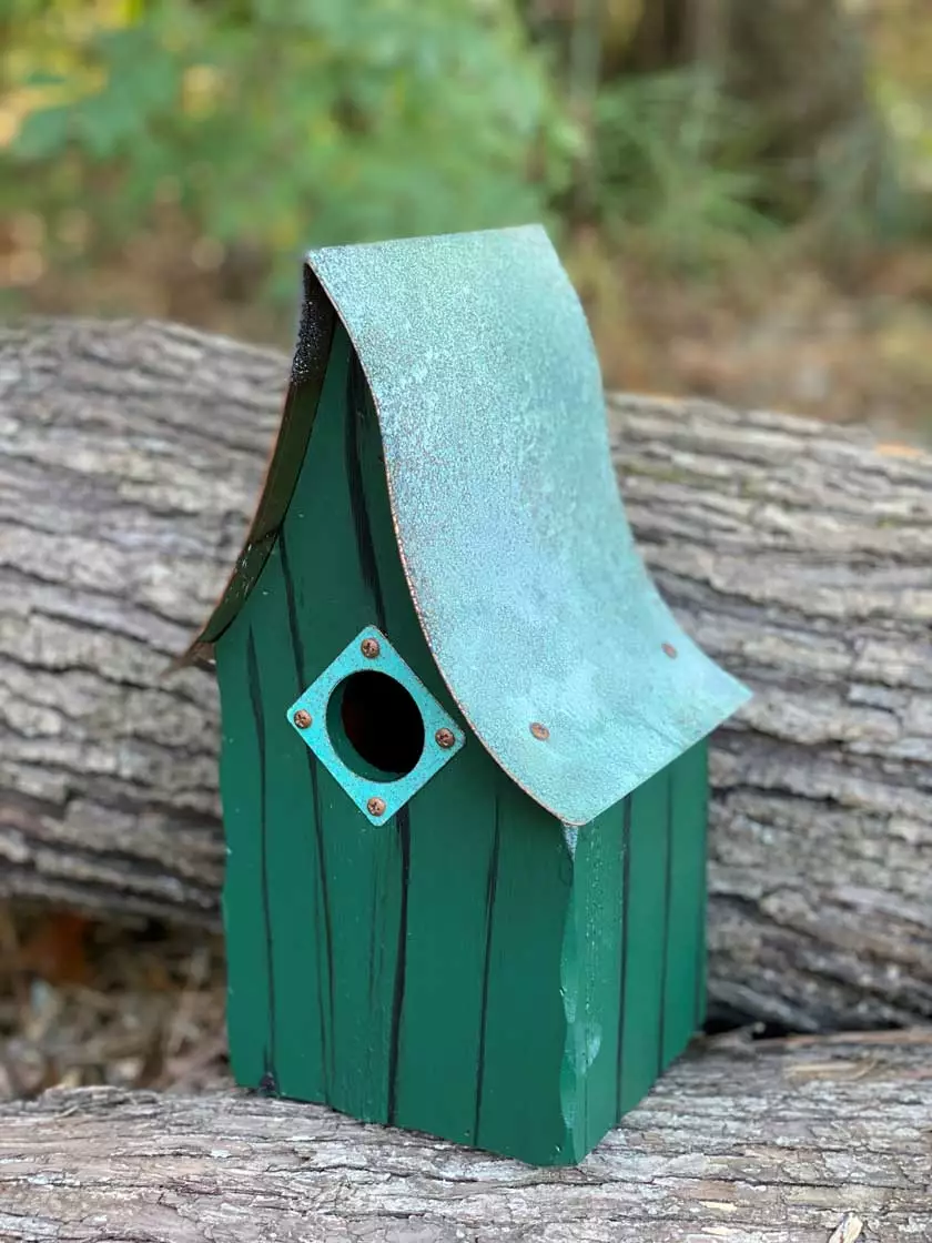 Your songbirds will have it “made in the shade” with this happy haven. Beautifully designed with cypress sides and copper verdigris roof, Shady Shed is also carefully constructed, hand painted and distressed for an elegantly aged look. Add in a copper leaf/predator guard, and all together it’s the kind of care your songbirds deserve and need. 1.5″ entrance hole, square copper cover over a round clean out hole.