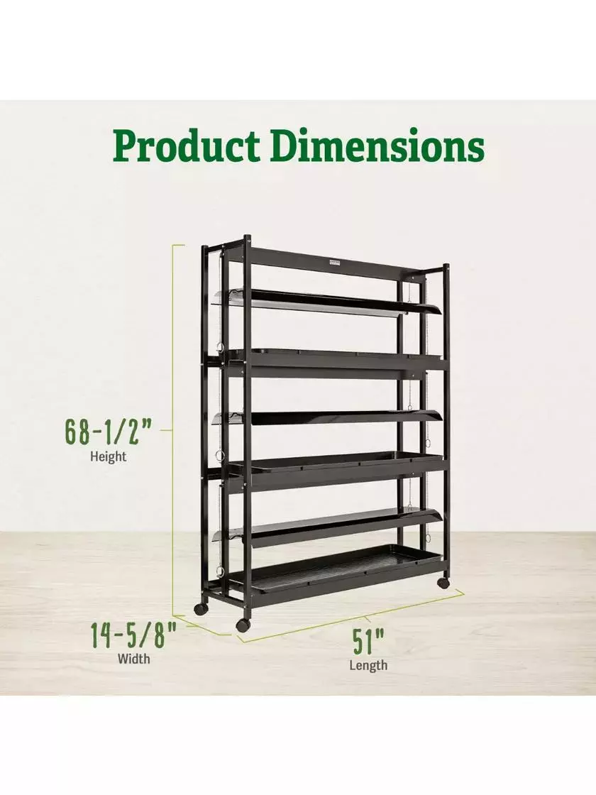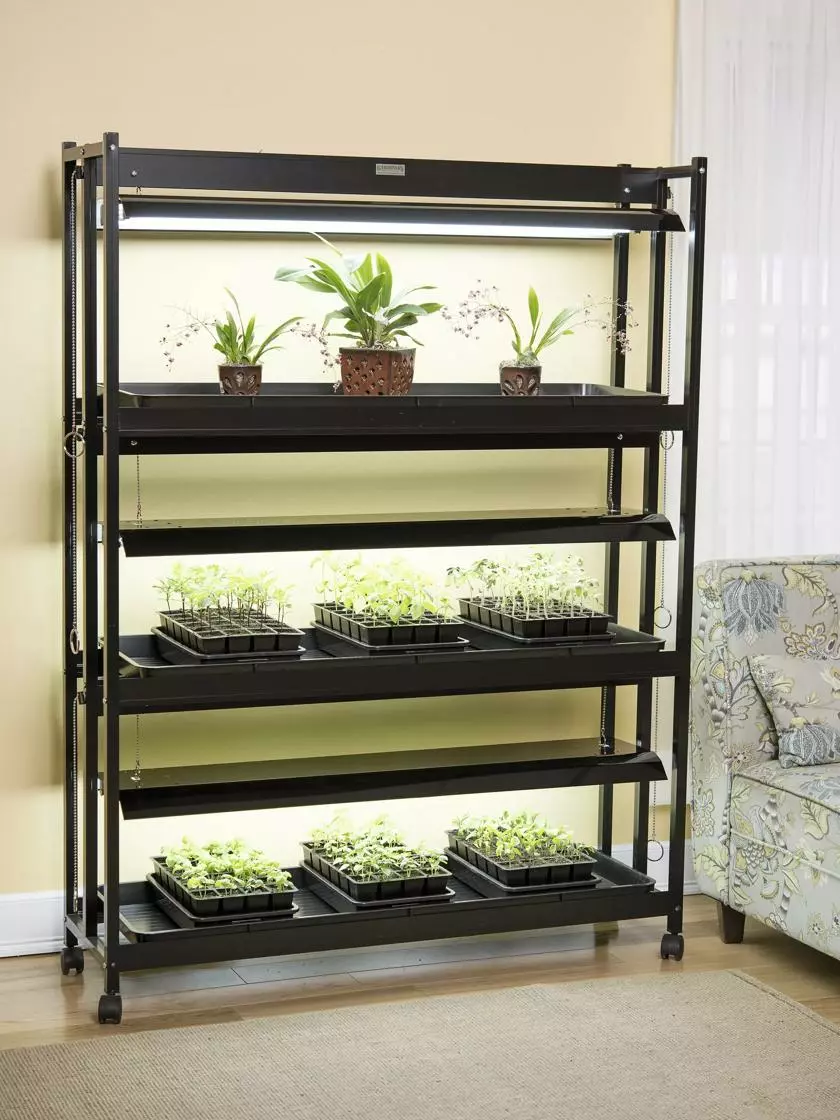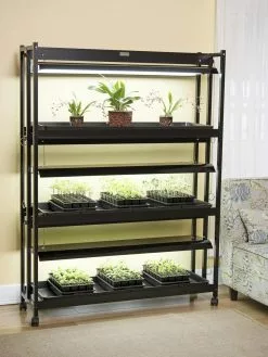 Each 4′ long fixture of this high-intensity light garden has three super-bright, full-spectrum T5 fluorescent bulbs, so it provides 50% more light than dual-bulb fixtures. Maximum light intensity is vital to growing orchids and other plants from seed all the way to flowering and fruiting. This grow light stand has a rugged, powder-coated, rustproof aluminum frame, and three growing shelves that provide plenty of room for seedlings and houseplants. The light fixtures easily adjust up and down as plants grow. Includes frame, light fixtures, T5 fluorescent bulbs, watertight trays and casters.