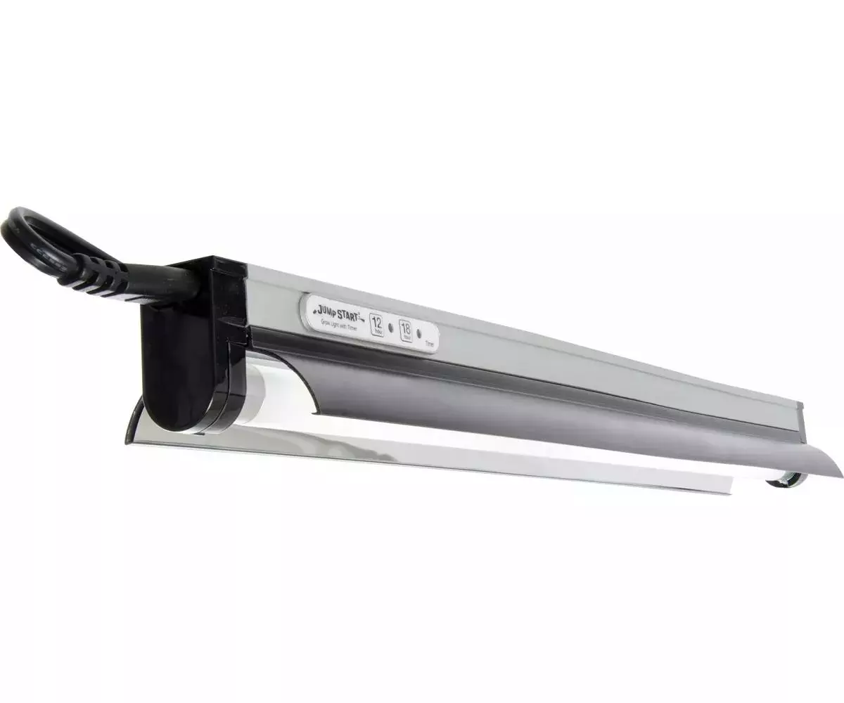 The Hydrofarm Jump Start Modular T5 Light Strip & Snap-On Reflector with Timer is perfect for giving beneficial light to seed starts, cuttings, herbs and more. This high-output, energy efficient T5 system ensures that your plants get the light they need for robust growth. The super-slim T5 Light Strip includes a 6400K full-spectrum T5 lamp, electronic ballast, hanging hardware, and power cord. The Omni-Max reflector easily snaps onto the 18″ T5 strip. The highly reflective material directs light downward, bathing your plants in full-spectrum light, and increasing your growing success with starts, cuttings, herbs, flowers, or vegetables. The built-in timer allows you to easily set a 12 hours on/12 hours off schedule or an 18 hours on/6 hours off schedule with a single button press.