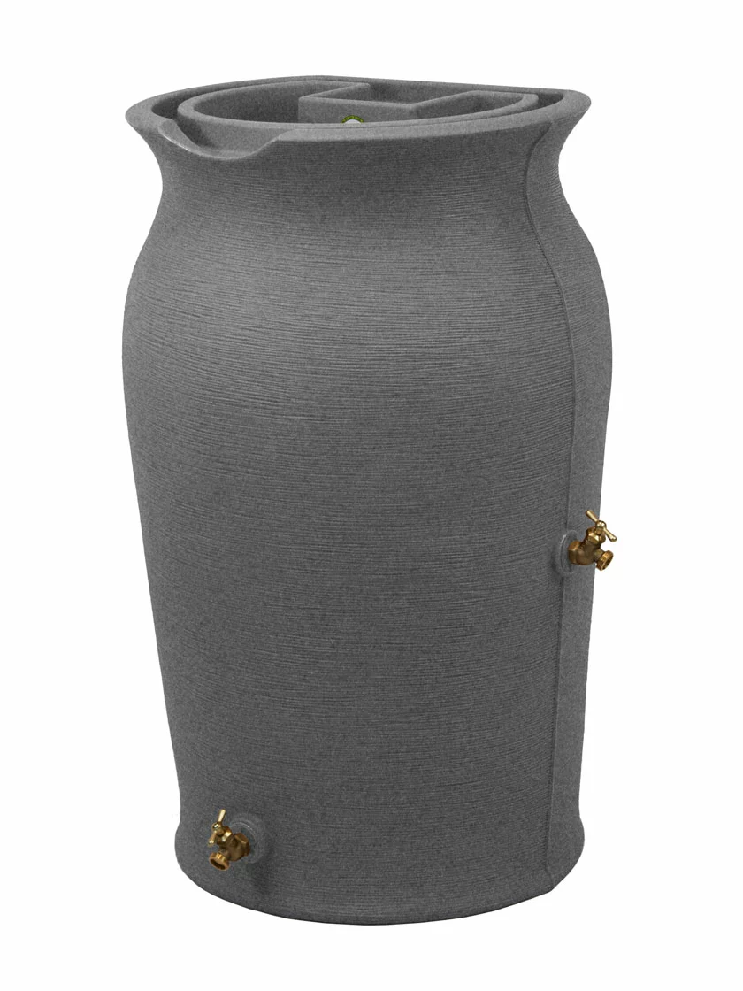Stria texture adds class and style to your rain harvesting. The meshed screen blocks debris from entering your water supply. Rain barrel is equipped with a sturdy brass spigot which won’t rust or break like plastic alternatives. Routed channel diverts excess water to the front of the barrel to avoid flooding your foundation. Handy dual spigot locations for hose or five gallon bucket.