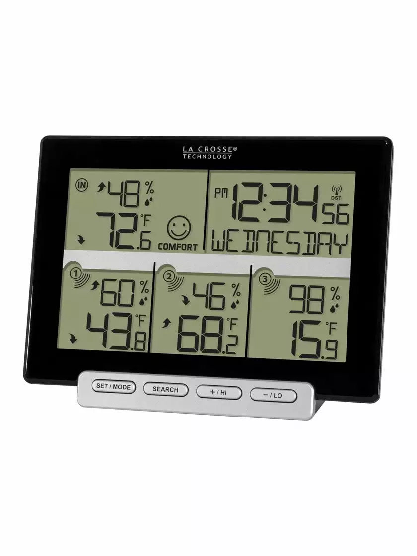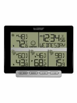 Multi-functional station shows you temperature and humidity indoors and out, as well as up to 3 additional rooms. Displays a smiley face for comfortable room climate, within +66.2F to 77F and 40 to 60%RH range. Displays frowny face, if at uncomfortable levels inside your home. Writable display, pencil only, to identify each room you’re monitoring from a storage room, basement, garage or other source. From the garage to the attic, let the wireless technology leave you in comfort knowing room conditions elsewhere. Battery operated, not included, with a 300 foot unobstructed wireless range from wireless transmitting sensors.
