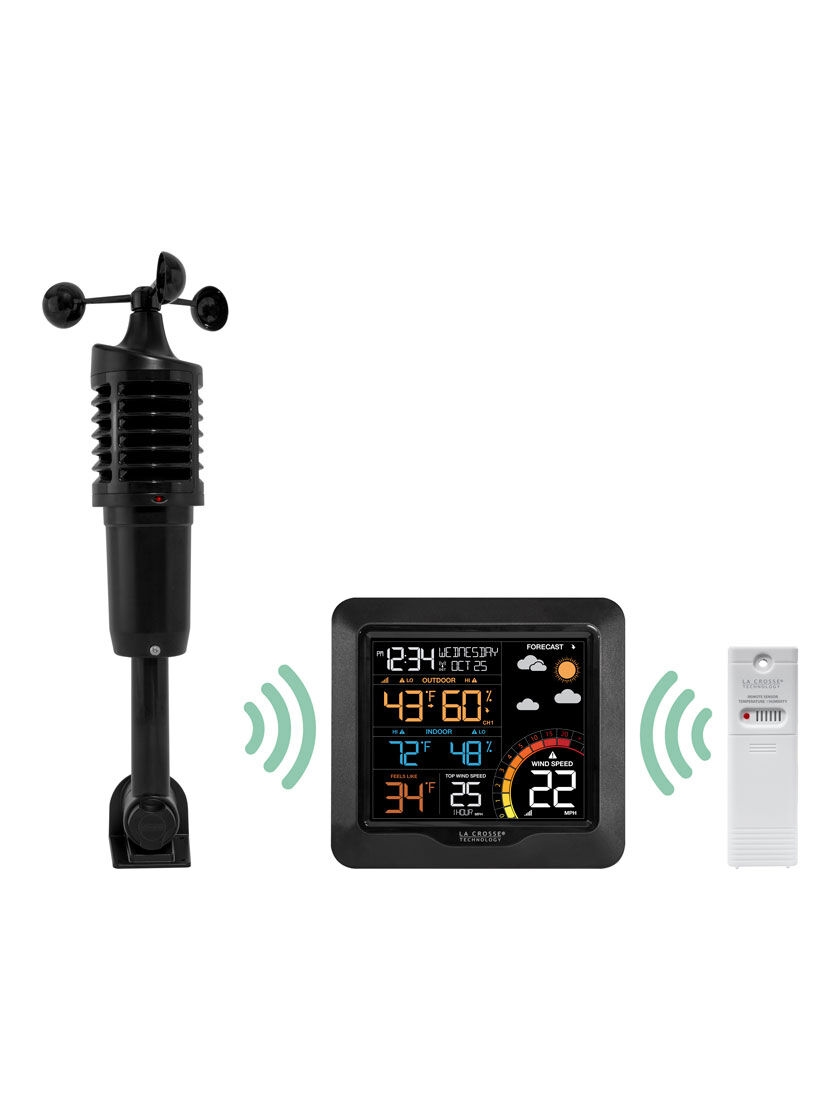 This remote wireless weather station will provide you accurate, backyard weather monitoring from inside the comfort of your home. Includes mounting bracket and easy to install instructions. Wireless wind sensor & temperature/humidity sensor transmit from a 330 ft range to your indoor console so you know what the weather’s doing without having to turn on a radio or TV. Self-sets time and date, automatically resetting for Daylight savings, adjustable temperature view, back light settings and wind speed readings, HI/LO alerts for temperature, humidity, and wind speed. Uses alkaline batteries, not included, to operate wind and thermo-hygrometer outdoor sensors.