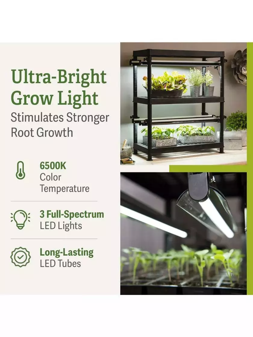 - 2 tiers of growing space, each equipped with 2 full-spectrum LED grow lights