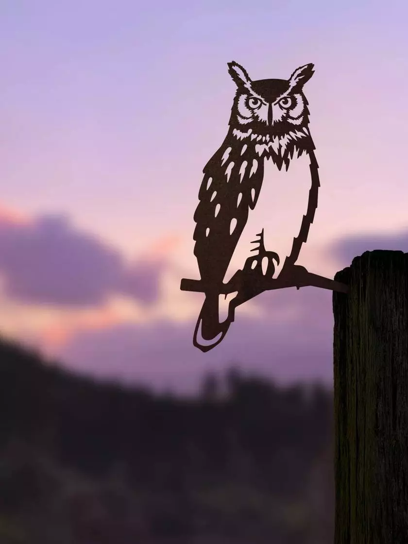 The great horned owl is a majestic bird that gets its name from the feather tufts on its head that resemble horns. Pick a post, fence, tree, or wall where you can see the silhouette against the sky or a single light color, grab a hammer and tap it in. Its beauty will shift with the changing light, weather, and seasons for years of enjoyment.