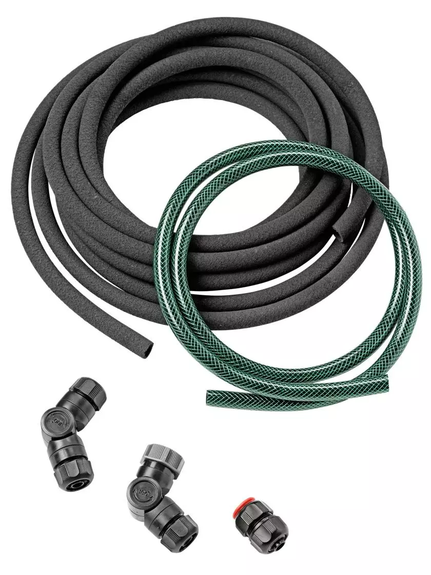 - PVC garden hose, recycled rubber soaker hose, plastic fittings