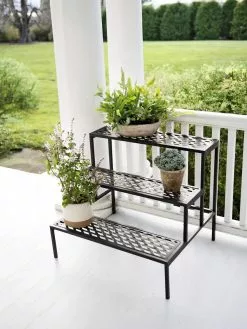 In summer, display your plants outdoors on porch or patio on this handsome stand. When the weather cools, bring both plants and plant stand indoors. The tiered design raises plants so you can enjoy them up close, and it holds multiple plants, freeing up windowsill, countertop and table space. This matte black stand matches our Quarter Round Lattice Plant Stand so you can showcase a larger array of plants.