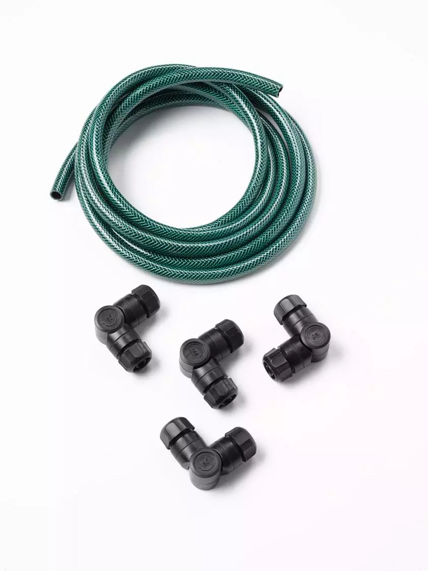 - Kit includes 4 angle connectors and 12′ of Snip-n-Drip Garden Hose