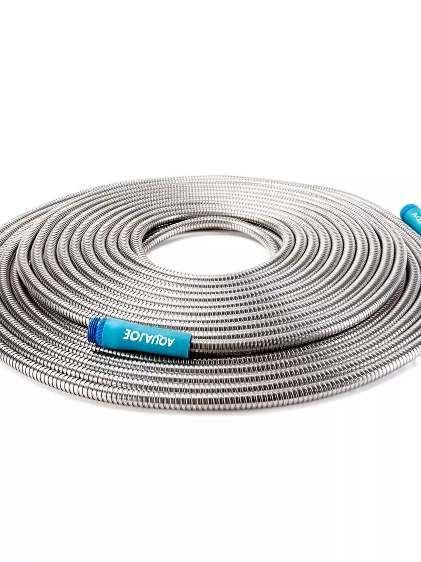 AQUA JOE’s lightweight stainless steel hose is quite simply the last hose you’ll ever need! Made from high-quality industrial grade 304 stainless steel for a lifetime of reliable use in your yard and garden. Won’t cut, crush or crack – won’t split, kink or get hot in the sun. It’s the one hose that works as hard as you do. A rugged, virtually indestructible and puncture-proof stainless steel outer sheath surrounds a flexible PVC inner core, for maximum performance and durability, and features bend restrictor collars and durable aluminum fittings at each end for unrestricted water flow and secure, leak-proof connections. Lead-free, phthalate-free and BPA-free. Perfect for watering the flowers, washing the truck, rinsing patio furniture or connecting to sprinkler or pressure washer.