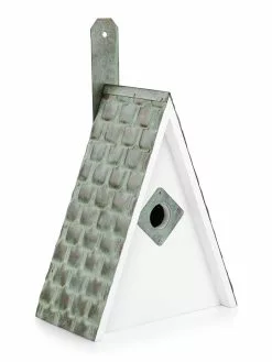 Designed by Good Directions with a durable structure, its sturdy body is masked by a beautiful face. A generous 3” hole on back with sliding copper door makes clean-up a breeze. Air vents circulate fresh air through the space and drainage holes are in the base. Our verdigris copper roof adds character and taste to long-lasting mango hardwood – coated in white paint. Perch-less 1.25” entry with copper guard protects from predators.