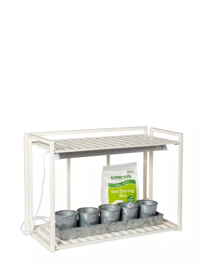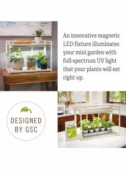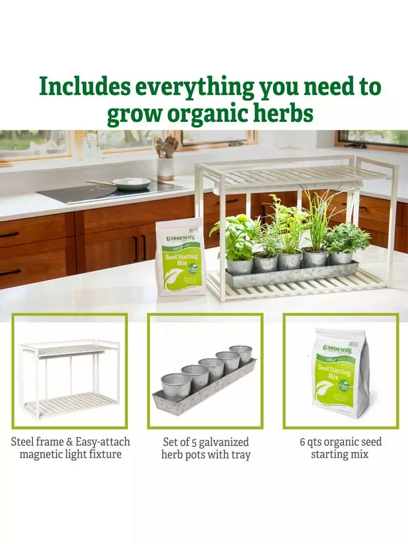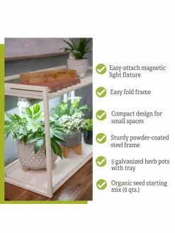 The fold-flat grow frame, made from sleek and sturdy powder-coated steel, perfectly fits the included set of five durable galvanized herb pots and tray — with room to spare. An innovative magnetic LED fixture illuminates your mini garden with full-spectrum UV light that your plants will eat right up. And a 6-qt. bag of our organic seed starting mix will keep herbs happy from the roots up.