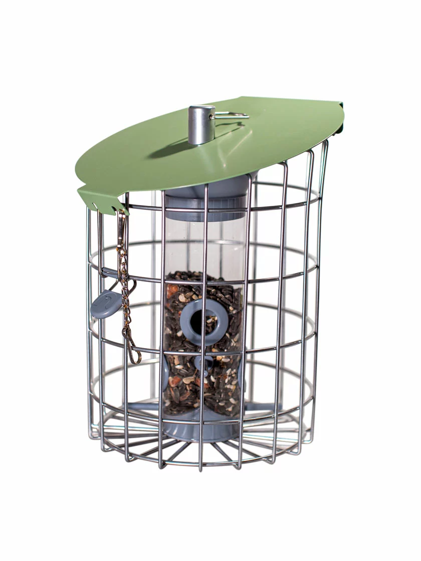 Superior quality, innovation and design without compromise. Simple and effective clip opening. Featuring only the highest quality materials and manufacturing standards. Built-in hopper is easy to clean and all-metal tube cage is impervious to squirrel damage. Designed to be easily disassembled and reassembled for cleaning. The Nuttery was founded by Leslie Lipton in 1990. An architectural designer by trade, Leslie had just watched the BBC’s Daylight Robbery which showed how squirrels can overcome obstacles to reach food left out for the birds. He set out to design a bird feeder that would baffle even the brainiest squirrel and so The Nuttery was born! Over 20 years later, our first feeder, the Original is as popular as ever. The Nuttery feeders – English innovation and design. It’s what we call bird feeding, The Nuttery way. Powder coated Steel, 4 feeding ports, Seed capacity: 1.37 lbs