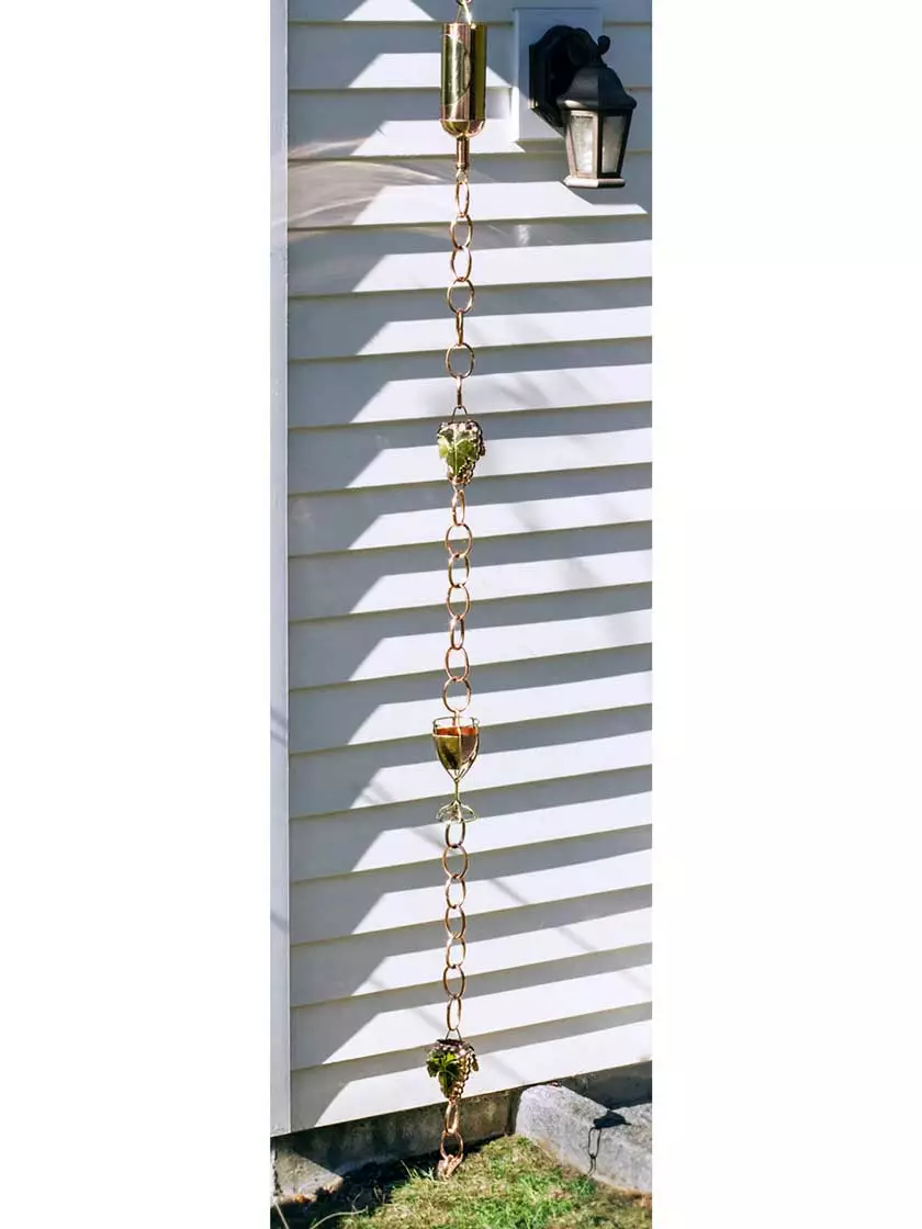 The Wine Bottle with Grapes and Glasses Rain Chain from Good Directions is artistically-designed and handmade using pure copper to create a rain chain that is both beautiful and functional. The wine bottle leader promotes the flow of water through the grape and wine glass ornaments. This rain chain is over 9-feet long and allows water to cascade beautifully from rooftop to ground. Each figure is carefully-crafted and thoughtfully-shaped to promote a smooth flow of water. You will welcome rain when you replace your ordinary gutter downspout with this inspired rain chain.